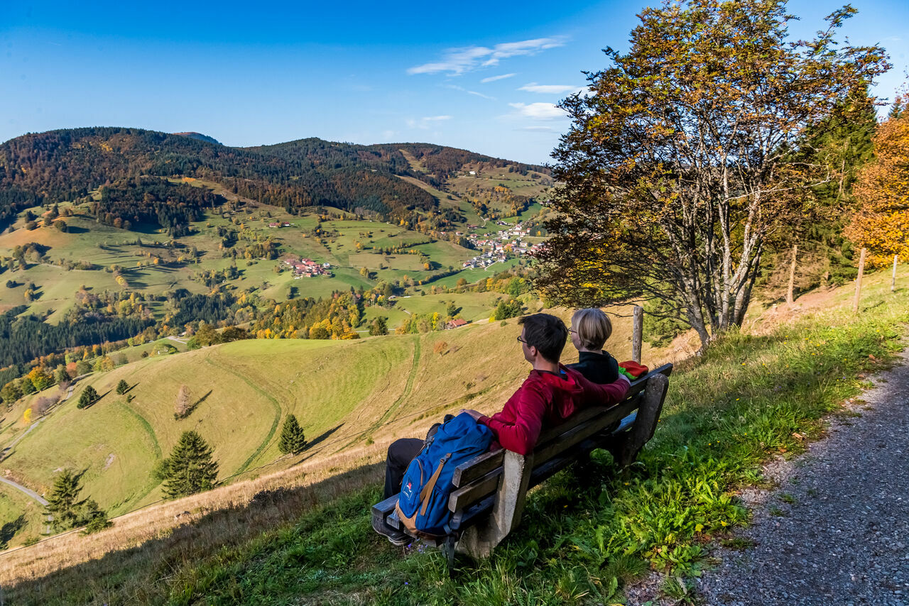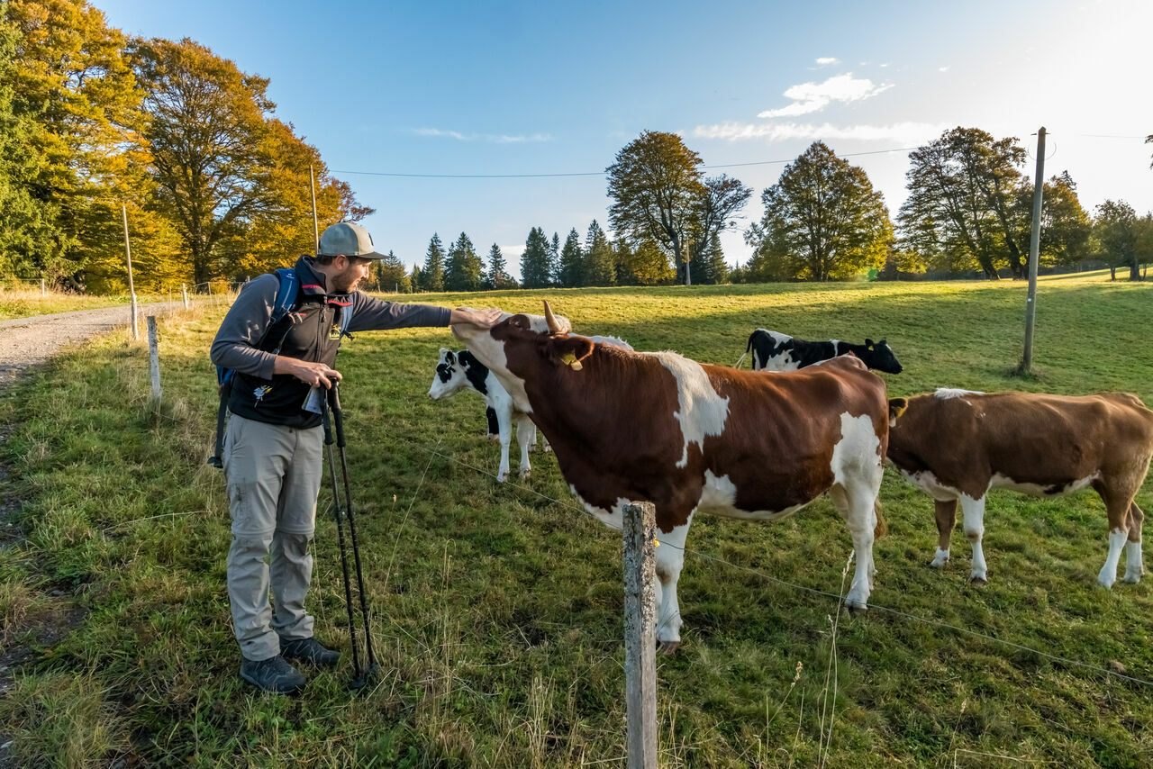 Vorbei an der Grabener Höhe sowie der Lailehöhe erreichen wir bei Kilometer 3,4 den Dachsrain. An diesem Wegkreuz, an dem gleich mehrere Wege in unterschiedliche Richtungen abgehen, wandern wir weiter in Richtung Geschwender Hölzle, das sich in 2,2 Kilometer Entfernung befindet. Hierzu folgen wir der blauen Raute. Nach nicht mal einer halben Stunde ist dieses erreicht. Wir folgen dem breiten Fahrweg geradeaus, bergab und passieren nach kurzer Zeit das Mitteleck sowie bei Kilometer 7,9 das Viehgatter, an dem immer im Frühjahr der Jungviehauftrieb stattfindet. Hier halten wir uns rechts, der gelben Raute folgend. Leicht auf, dann wieder absteigend führt uns der Weg nun größtenteils auf einer Höhe bleibend zum Wiedener Eck. Unterwegs passieren wir die Rütte. In dem kleinen Wiedener Ortsteil halten wir uns nun rechts und folgen der Holzbeschilderung zum Wiedener Eck. Der Weg steigt leicht an, während wir unterhalb des Weges eine schicke Holzhütte, das Chalet Abnona entdecken. Nach wenigen Metern tauchen wir wieder aus dem Wäldchen auf, in das wir eben noch eingetreten sind. Vor uns öffnet sich nun der Blick und wir lassen uns von dieser magischen Landschaft und ihrem sensationellen Ausblick über das Wiedener Tal bis hinweg zur Schweizer Alpenkette begeistern. Wir queren einige Weidfelder, durch die uns nun der Wegverlauf führt (Hunde bitte unbedingt an die Leine nehmen!) und erreichen bei Kilometer 11,3 das Wiedener Eck, die Passhöhe, die das Münstertal vom Oberen Wiesental trennt.