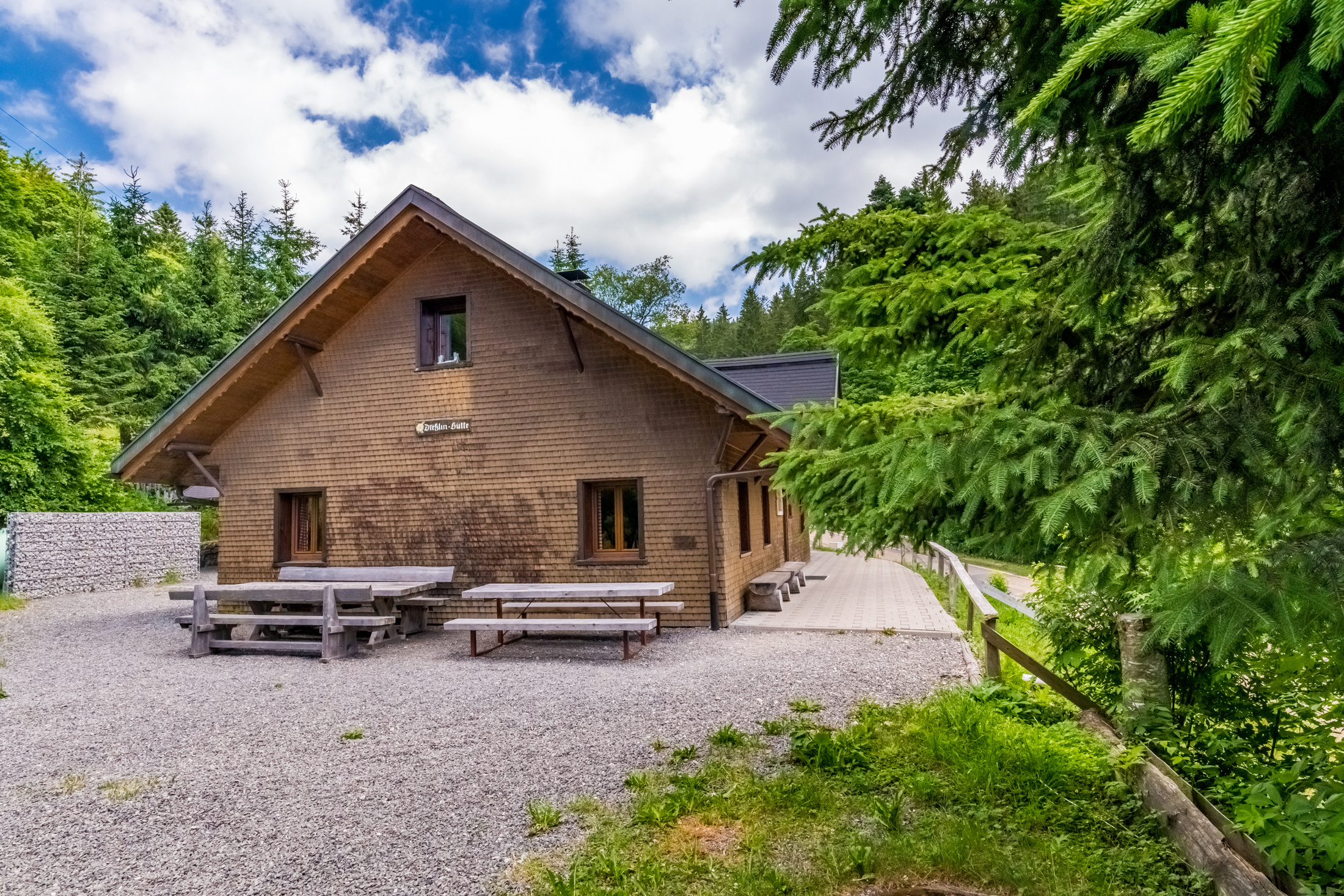 In dieser Senke halten wir uns nun links. Wir folgen dem Wanderweg zur nahegelegenen Schutzhütte und passieren diese, ehe wir kurz darauf die Kreisstraße erreichen. Wir überqueren diese und folgen dem auf der anderen Seite in Richtung Untermulten führenden Wanderweg. Vorbei an zwei alten Schwarzwaldhöfen gehen wir auf dem aspahltierten Sträßchen, ehe wir die Kreisstraße wieder erreichen. Vorsichtig folgen wir dieser für 50 Meter talwärts. Hier erreichen wir die Kreuzung, an der die Straße nach rechts bergauf zur Talstation der Belchen-Seilbahn führt. Wir aber gehen noch wenige Meter geradeaus und sehen dann auf der rechten Straßenseite bereits die Dießlin-Hütte, in der wir die heutige Nacht verbringen werden.