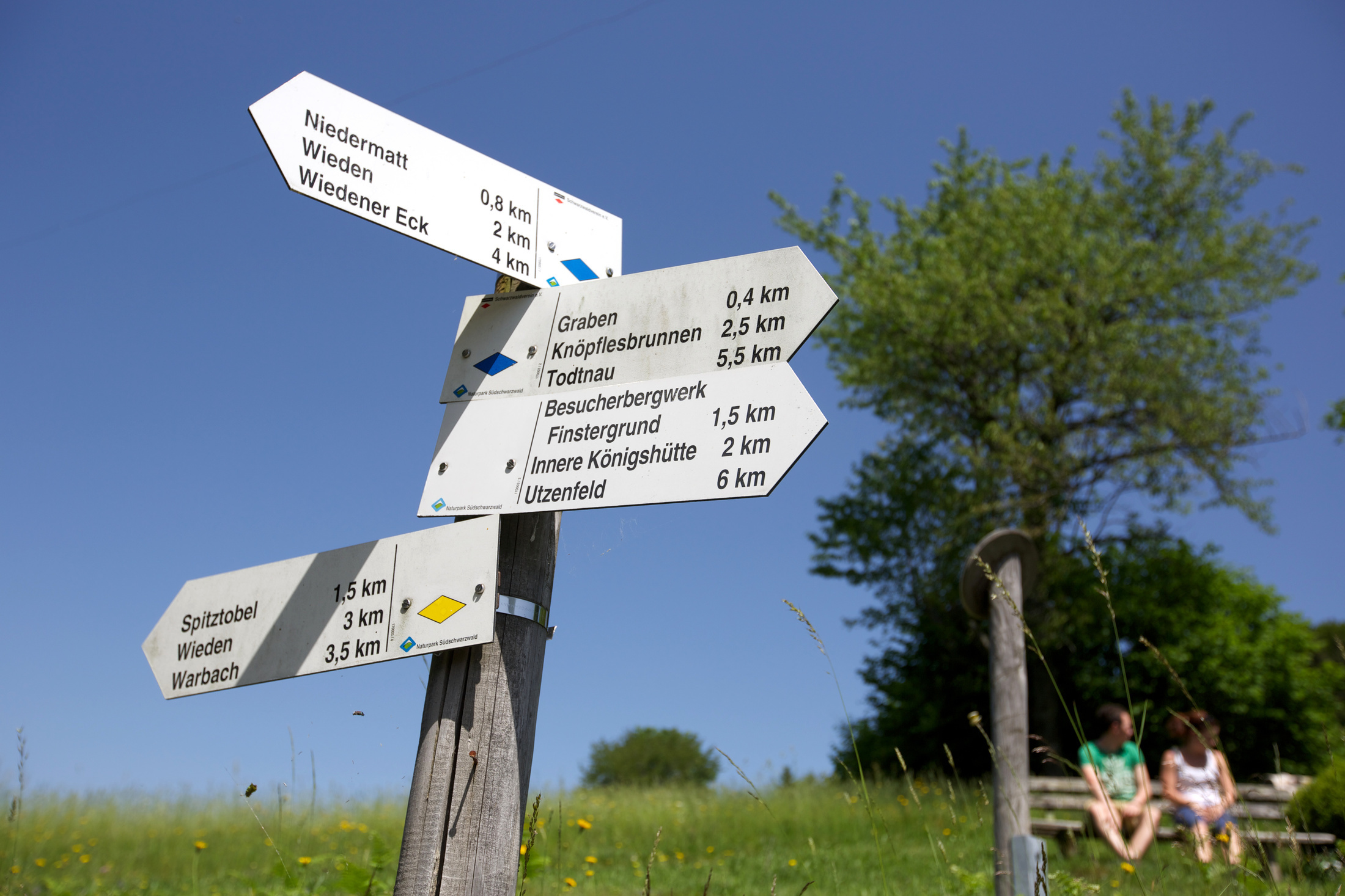 Wegweiser stehen an wichtigen Ausgangspunkten für Wanderer (z.B. Bahnhöfe oder Wanderparkplätz) und überall dort, wo markierte Wege aus mindestens drei Richtungen aufeinandertreffen. An allen Wegweiserpfosten gibt es eine Basisbeschilderung (weiße Schilder). In jede Richtung weist dabei mindestens ein Wegweiserblatt und gibt Ziele und Entfernungen an.Überall da, wo auf dem Wegenetz touristische Wanderrouten liegen, finden sich neben der Basisbeschilderung auch die kleineren Tourenschilder. Dies ist zum Beispiel entlang des Premiumwanderweg Belchensteig der Fall. Für den Belchensteig gibt es eigene Schilder sowie Bestätigungszeichen, die im regelmäßigen Abstand zu finden sind.